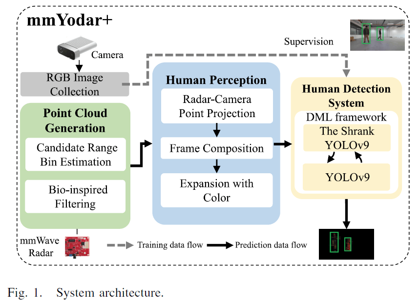 mmYodar+ 系统概述:在本文中,本文介绍了mmYodar+,一种创新的系统,利用毫米波雷达在人体检测中的独特优势。本文的系统解决了传统视觉方法的局限性,并在各种真实世界场景中提供可靠和准确的检测。由于本文将毫米波数据转换为雷达图像,系统为基于毫米波的物体检测系统提供了统一的基准,能够采用成熟的基于图像的模型。